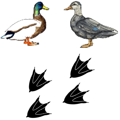 Aussehen: braun-weißes Gefieder (Weibchen), weiß-schwarzes Gefieder und grüner Kopf (Männchen)